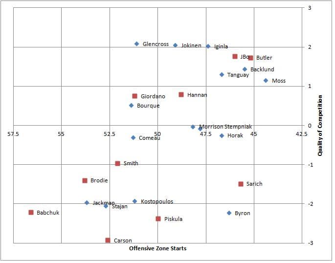 In Mark Giordano’s absence notice how Scott Hannan is starting in the defensive zone more and more often, and how Derek Smith is gradually playing against tougher competition.