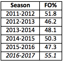 Another huge reason for Stajan’s great start is his work in the faceoff dot. To date, Stajan has been Calgary’s best faceoff man and he’s shown a huge uptick in that area from what we’ve seen in recent years, specifically last season. Below is Stajan’s work in the faceoff dot over the last number of seasons.