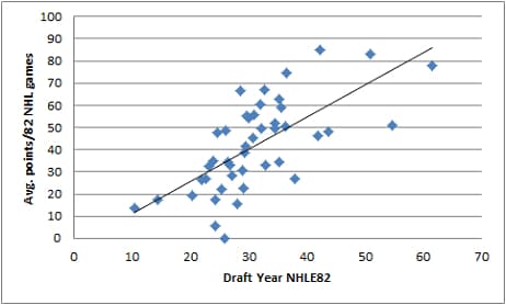 That said, there’s a reason to pay attention to NHLE. Via Willis at the Cult of Hockey, the correlation between NHLE and future NHL point-per-game pace: