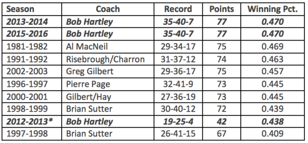 If you take the 2014-15 season out of the equation, Hartley’s record looks significantly worse. In fact, under Hartley, the Flames had three of their more mediocre campaigns ever. Below is a look at the team’s 10 worst seasons by win percentage and who was behind the bench. The asterisks denotes the 2012-13 campaign as a shortened season due to a lockout.