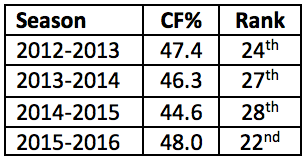 One of the biggest complaints during Hartley’s tenure was how poor his teams were on the possession side of things. Indeed, the Flames were routinely outshot over that four-year span and regularly spent more time in their own zone than at the attacking end of the ice. The most damning thing about this was the team’s lack of any real progression in this area over four seasons as illustrated below.