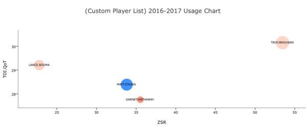 Sometimes huge swings like this can be partially explained by a player’s usage: if he’s deployed in an extreme shutdown or defensive manner, then other players’ results with him will naturally take a dive. That’s not true of Brouwer on the Flames, however. He plays a decent level of competition, but most guys you see above actually enjoy higher offensive zone deployments with him vs without him.