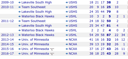 Kloos has had a successful career to this point. He won Minnesota’s Mr. Hockey award, given to the best high school player, for a season where he scored 81 points in 25 games. He was second in USHL scoring in 2012-13, finished top five in scoring at the University of Minnesota all four years, and finished first in his junior year. Throughout all four years, Kloos has scored 150 points in 155 games. That’s pretty good.