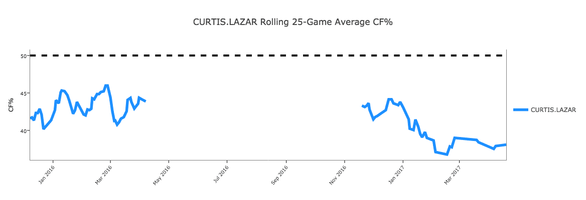Here’s his rolling Corsi percentage for the past two seasons.