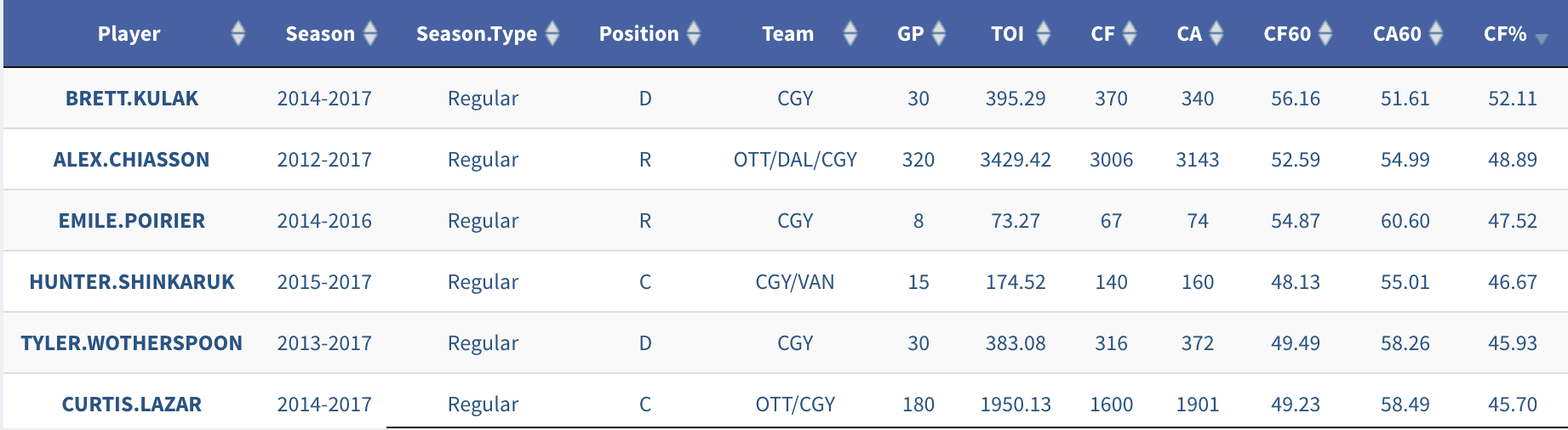 While Lazar hasn’t been good in his NHL career, he also doesn’t compare well against similarly aged players that the Flames will likely expose in the expansion draft. Throwing out Lance Bouma, Matt Stajan and Troy Brouwer for their cap hits, which should be enough to scare Vegas off, here are the prominent young Flames and their NHL careers. It’s sorted by career Corsi For percentage.