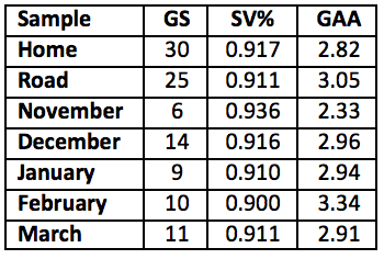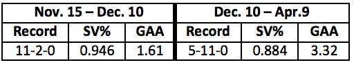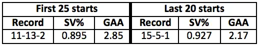 Perhaps the most frustrating of Calgary’s goaltending struggles last season was the wild swings in form we saw. Elliott was scorching in the second half of the season but dreadful in his first few months with the Flames. Similarly, Johnson put together an elite run of hockey in November and December but was generally average the rest of the way. For Elliott, his season is easy to split into two halves, one good and one bad.