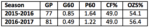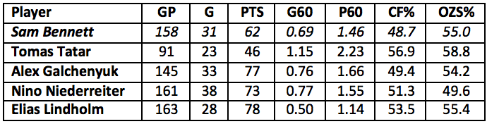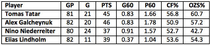 With the exception of Tatar, who took a slight offensive step back, each player saw their point totals improve from year two to year three. That’s promising news for Bennett, and it would make sense to see him rebound from his difficult 2016-17 campaign. I’m not talking about him doubling his point totals, but going from 26 to 40 points isn’t out of the question at all.