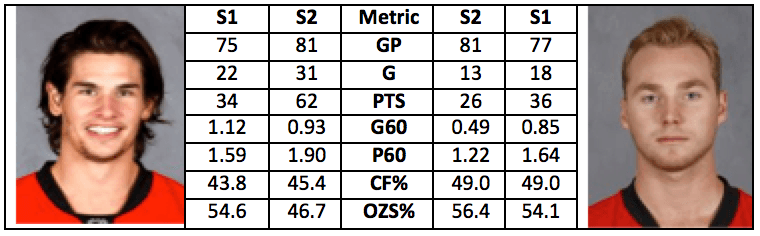 Season two saw Monahan start to develop into a top flight centre who could be deployed against, and score against, top players on the other side; since his rookie campaign, Monahan has developed into a perennial 60-point player. For Bennett, though, year two saw steps back all over the board. He was given more offensive zone starts without a commensurate bump in possession rates and his scoring dropped significantly.
