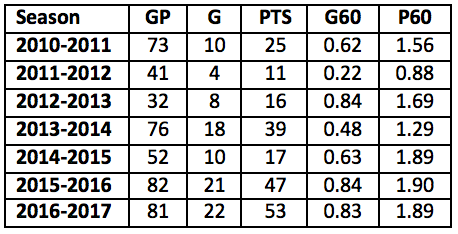 2016-2017: 81 GP, 13 G, 13 A, 26 PTS