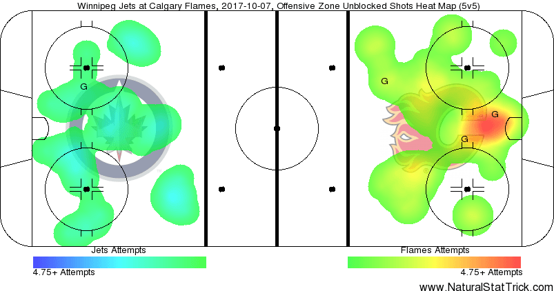 In their season opener, the Flames gave up 45 shots. This time, they had 45 shots of their own. And Natural Stat Trick’s heat map is very flattering this time around: