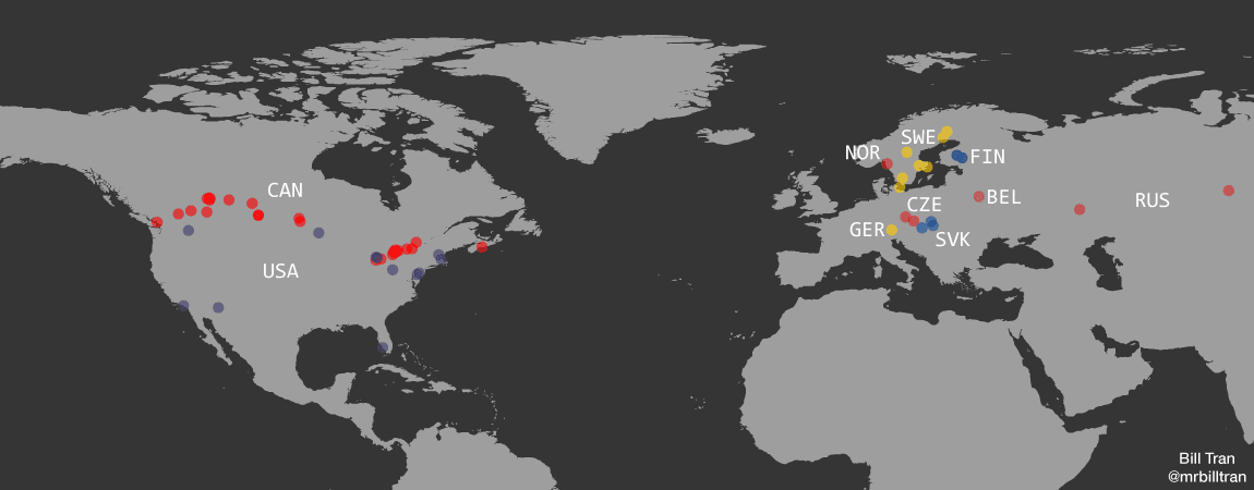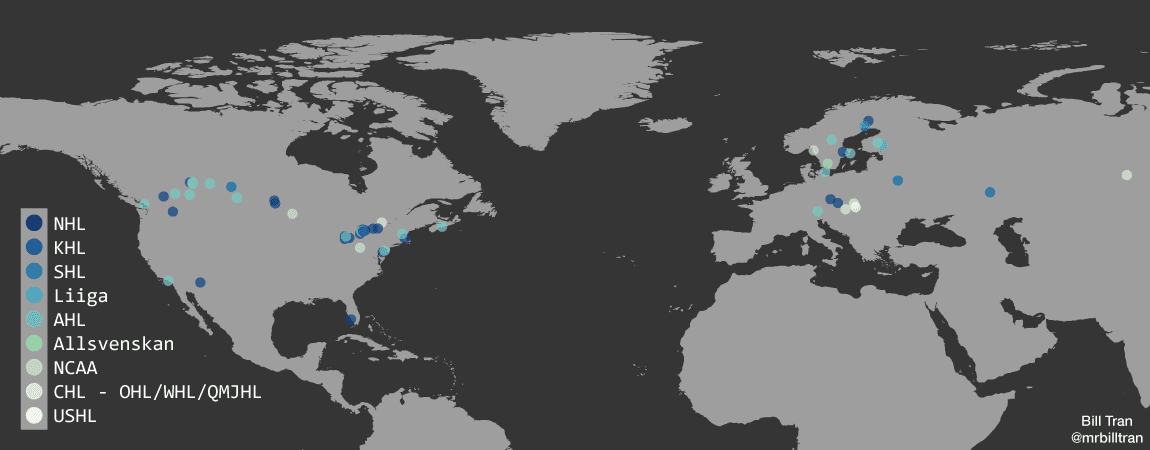 A high-level way to evaluate how players are developing for the Flames is to look at which league they play in. With player origins fresh, plotting birthplaces colour-coded by their respective league presents a fun perspective on the distribution of talent in the system.