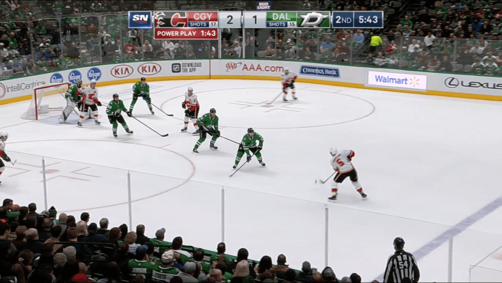 It’s a pretty simple 1-3-1 setup, but the way the Flames utilized it allowed for rapid-fire passing. On this goal, Tkachuk (top of the image) is prepping to receive the pass. He’s able to walk in a bit and beat Bishop with a wrist shot because his positioning (and the alignment of the other players) leaves it unclear if he’s going to shoot or pass, so the Stars PK can’t fully commit to either until it’s too late.