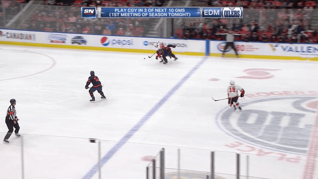 At the bottom of the screen, Tkachuk recognizes the play developing and wanders into the neutral zone. Ethan Bear is focused on the puck battle at the side of the zone, likely concerned that if Mangiapane blows past Nurse he’ll need to scramble back to break up a scoring chance.
