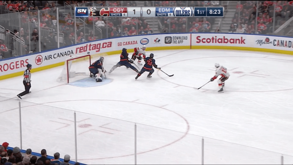 Mangiapane wasn’t successful in fully driving to the net, but by this point Nurse is too deep to really do anything but block the path to the net. However, Bear has over-committed to backing up Nurse – there’s no value in Bear being beside Nurse when Nurse has already blocked the (bad angle) shooting lane.
