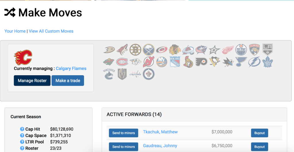Once you head on over to myPuckPedia, sign up and select the team you want to play GM with. (If you want to reset things, hit “Sync” and it’ll return to reality and then you can make different moves.)