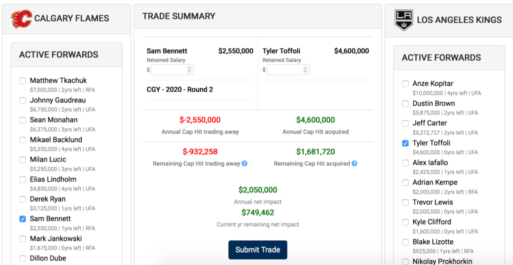 The Kings are looking at their future, so my proposal involves dangling Sam Bennett – with a year remaining on his current deal with a $2.55 million cap hit – and a draft pick for Toffoli. For our purposes, it probably would be a conditional pick contingent on either Toffoli re-signing with the Flames or some measure of playoff success – a third round pick that could graduate into a second if conditions are met.