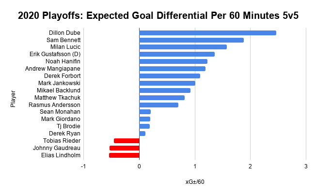 Dube ranked just below Gaudreau and Backlund (both at 0.70 ixG/60) in terms of his individual expected goal rate and was fifth on the club in generating high danger scoring chances.