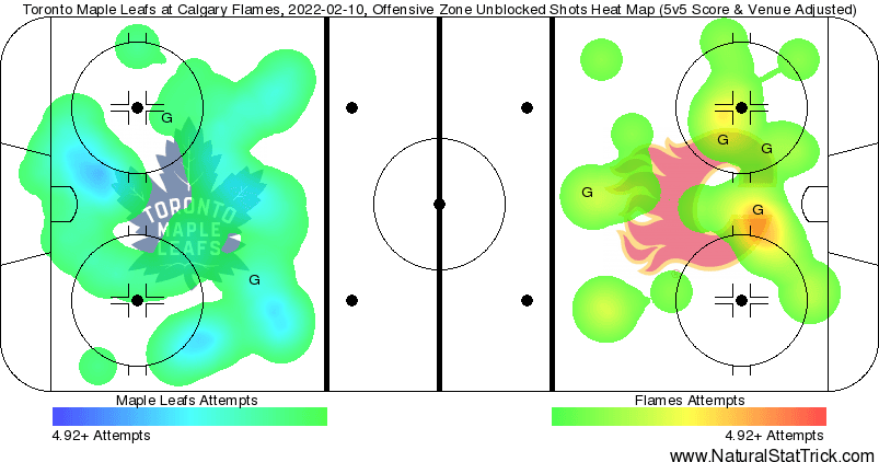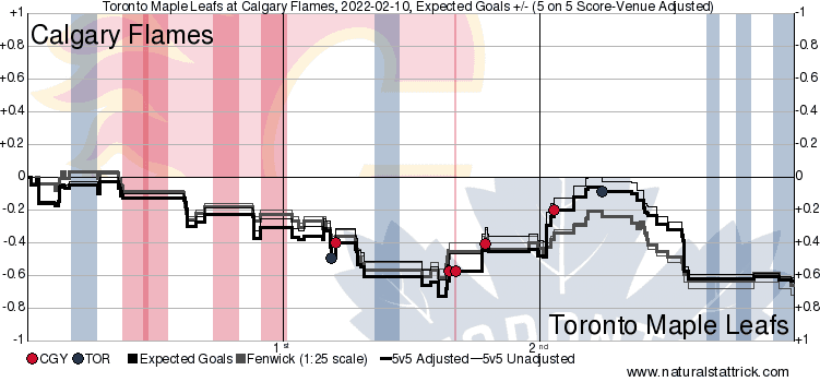Calgary took the wind out of Toronto’s sails for a little bit with their back to back goals 35(ish) seconds apart. Took it all the way up until Bunting got the Leafs their second goal. Leafs took play back for a bit after that but once the power plays started the 5v5 shot creation stopped.