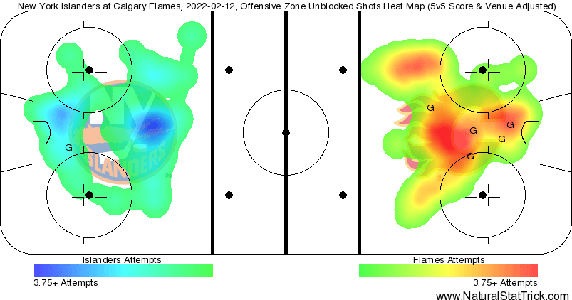 Islanders very clearly were not interested in shooting the puck from the sidewall, but that was all Calgary would give them from the middle of the zone and below. Credit to the Islanders defenceman for doing the one thing they could do and that was get to the middle of the ice and fire it. If that is all a team can muster they better hope they get deflections or bounces. Very difficult for a team to score 3 or more goals when defended as well as they got defended. Calgary – 5 goals fired from the middle of the ice – 4 at the hashmarks or below – and all at 5v5. They just showed the Islanders what they’re made of.