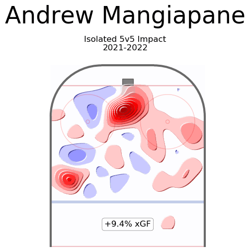 Looking at just this year it would be acceptable to understand Toffoli’s numbers may take a hit due to the current state of the Canadiens. As we can clearly see that without Toffoli Montreal can’t create anything – at all. Toffoli has a knack to drive the net from the right side of the ice in an eerily similar manner to Mangiapane. He prioritizes shot opportunities from the dangerous are of the ice, which is great because that’s what this year’s version of Calgary has been doing since the puck dropped in October. Now these impact charts are team effects, but lets look at his isolated impact next to Mangiapane’s.