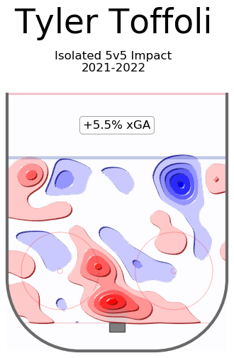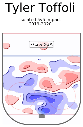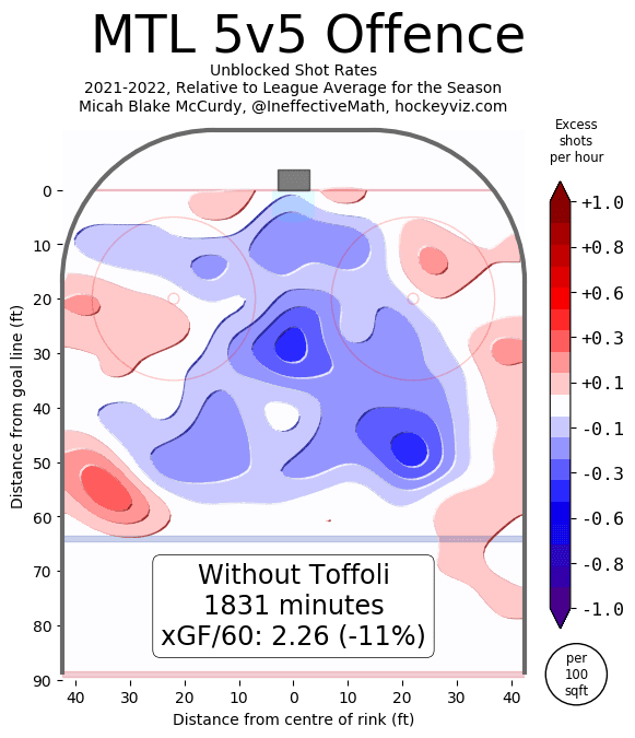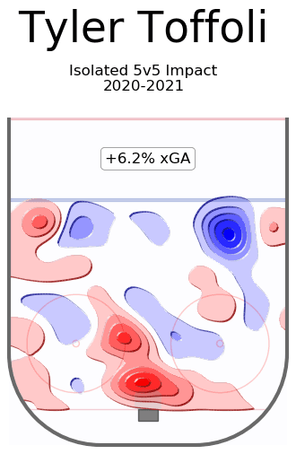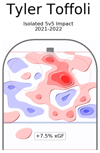 We start with a direct comparison to the player Toffoli is replacing on the roster. If you read my piece on the JT Miller rumour then you can have a bit more knowledge on being able to read the charts and heatmaps I’m going to share in this piece as well. Offensively the two sections we want to focus on are GF/60 and xGF/60. GF/60 are actual goals put in relative to the leagues replacement level while xGF/60 is the stat that captures the creation of the opportunities. Calgary just got a full 2 standard deviations of offensive creation added to their lineup, and I’m not too worried about his defensive impact (more on that later).