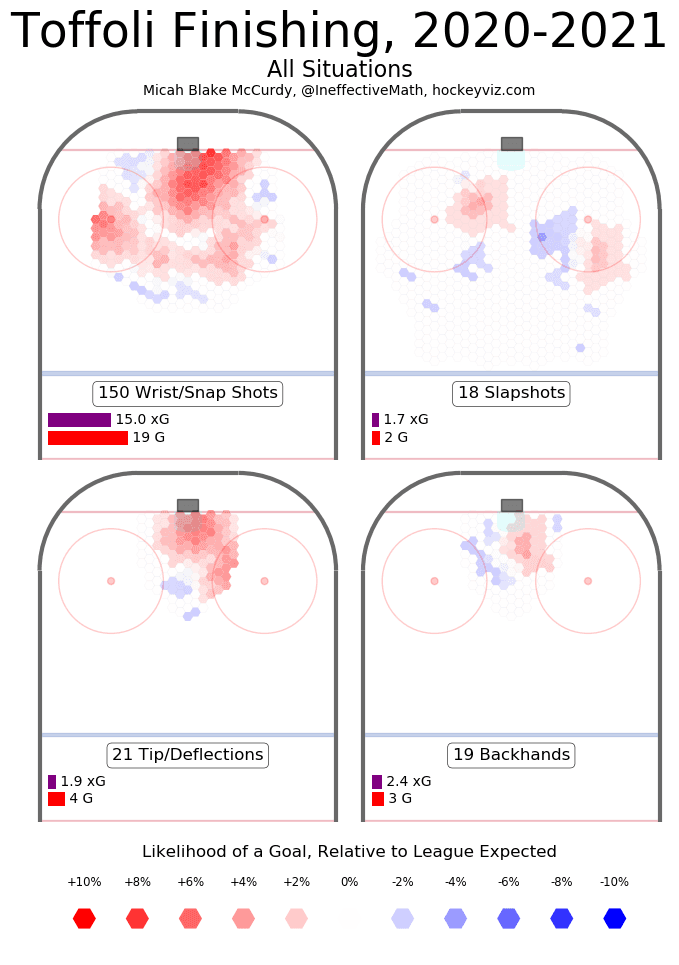 Two guys that love creating chaos around the oppositions net. These are their individual contributions to offence when they are on the ice taking teammates out of it. Toffoli was able to get to this level of positive impact this year on a lacklustre team that is spiralling in the basement of the standings – coming to a team with a clear identity in Calgary (one he will be extremely familiar with) will only help him find more offence. This year he only has 9 goals to date and is still finishing above replacement level. Lets look at how he was able to finish off chances last year on the team that were able to make the cup final.