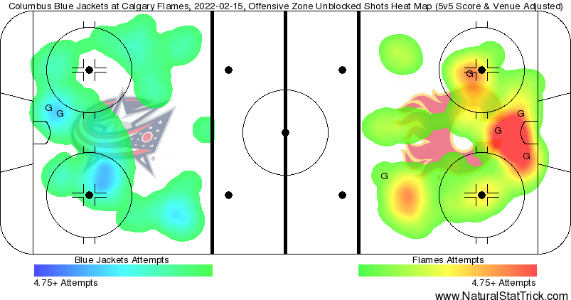 In games so one-sided the heatmaps are my favourite thing to look at. You can clearly tell based on quality and location (and volume) of chances which team deserved the win. Columbus is a non-playoff team this year and Calgary beating them was something that should happen more often than not.