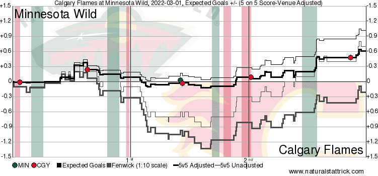It isn’t like the Wild absolutely ran away with this one in terms of who controlled play at 5v5. No that’s wrong to say – the Wild did control play at 5v5 however the total amount of dangerous chances they were able to get was still low. Pretty much all of their highly dangerous chances were just from Kaprizov and company – they had 6 of the 9 high danger chances all Wild players were able to generate. Calgary used their PP and some very timely 5v5 goals *cough* Lindholm *cough*.