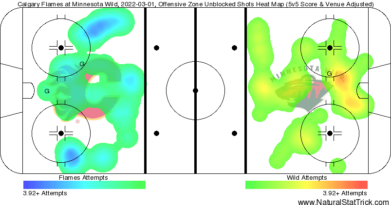 Taken By Chance – 10 players failed to register a quantified high danger chance at 5v5. Elias Lindholm (30.20 SCF% // 0 HDCF%) got that great one-time goal but it was from far enough away it was classified as medium danger. Medium danger can obviously still be dangerous, but its nobodies first preference to shoot from farther away consistently. The Wild’s best player Kirill Kaprizov (69.71% // 100%) had the Flames top line hemmed in at times. The puck seemed glued to his stick as he weaved through traffic – similar to how we’ve seen Johnny Gaudreau (28.08% // 0%) do oh so often.
