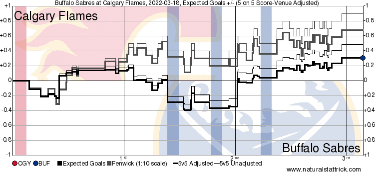 Buffalo rebounded from an early penalty kill in the first before Calgary was able to snag some momentum back. The second period saw the Sabres get some massive chances – all those long lines are significant attempts that Markstrom saved. The Flames grabbed momentum back with a strong third but lost it in the randomness of 3v3 OT.