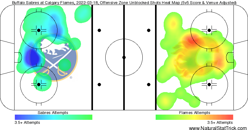 It’s a Team Game – The Sabres were able to get seven high danger chances in the second period. They made it a priority all night to shoot the puck from directly in front of the net and nowhere else. You’ll see down at the heatmap. Calgary may have taken more attempts, but the Sabres played strong defence themselves, keeping Calgary from chances in tight. The bounce back was present but not enough – that’ll happen sometimes.