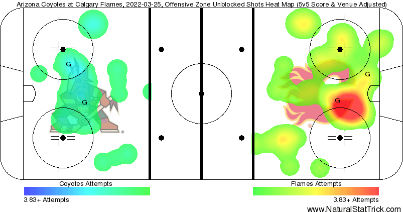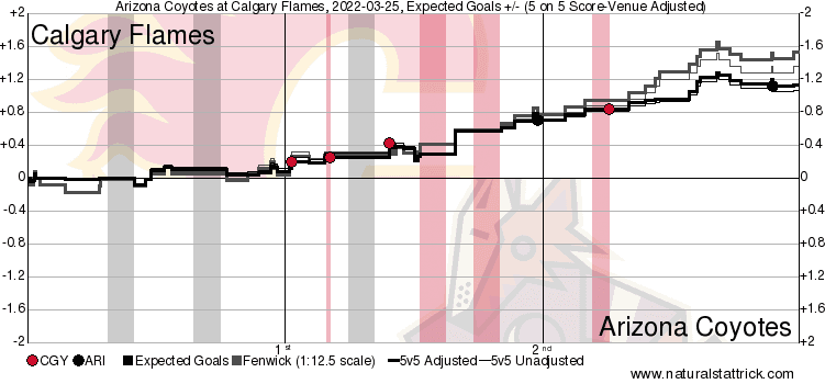 In The Crease – Markstrom really didn’t face a lot of work tonight, but he still probably wants the goals back. I already mentioned the bad turnovers twice, but I never added in the Carcone goal had traffic in front of him too because of the area the puck was turned over. He may have been falling asleep in there too as in the final two frames the Coyotes hardly got anything on net. 0.92 expected goals against with two medium danger goals getting by him. A five on five save percentage of 0.833%.