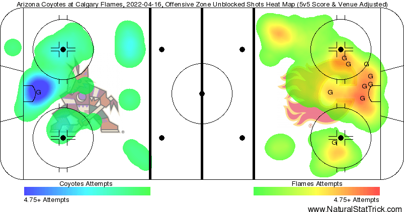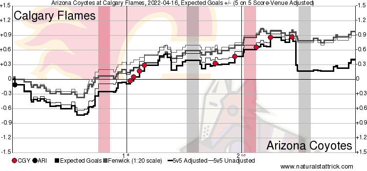 That slow start we touch on is very visible in terms of who was getting all the chances. Calgary actually was able to pick it up starting in the latter half of the first. The starts are the most important thing come playoff time – good teams know how to limit and shutdown others when they have a lead. There’s less space and less chances to score. Arizona did not bring that level of resistance – Take the two points and move on.