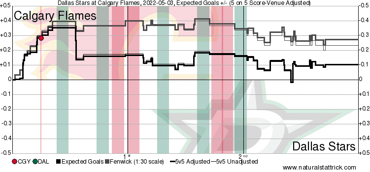 It’s a Team Game – Overall the high danger chances were even… at 3 a-piece. Remember this is just 5v5 and in the first 40 minutes play kept getting broke up by penalties. The refs seem to have had an extra whistle in their pockets to start the postseason too – a vast difference from years past. Calgary is built to win games – and has practiced winning games – in many different ways this season. If the next game ends up more open Calgary can compete there too – they would have had more goals if not for a solid performance from Jake Oettinger. Very close to being a stolen game from the Stars goaltender.