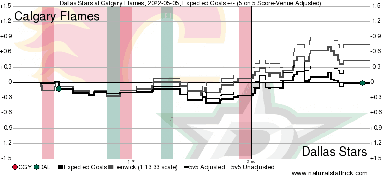 It’s a Team Game – The majority of the attempts by a significant margin, yet not a victory in the high danger chances. They did not do a good enough job at getting to the crease. Players like Andrew Mangiapane and Matthew Tkachuk made a living out of it all regular season but for two games now the Stars have been able to stop them. The Flames defence has been fine – 1 goal against a goaltender through 6 periods is always great – which makes it even harder to be tied 1-1 through 2 games.
