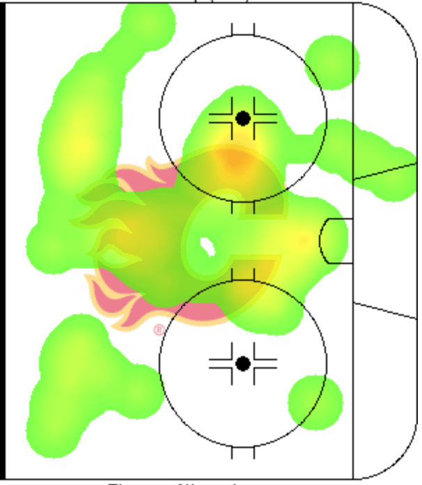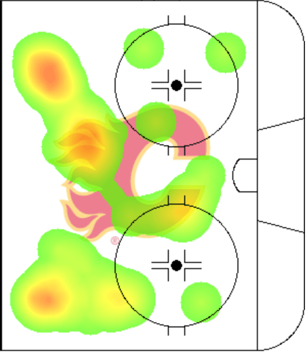 Via Natural Stat Trick, here are the offensive heat maps for the Flames for the series so far: the first one is Game 1, the second one is Game 2.