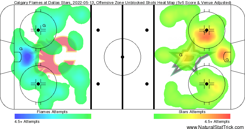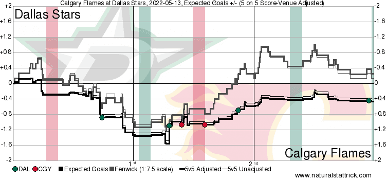 In The Crease – Markstrom has been an absolute massive reason Calgary were able to even be in the position to close out a team, but I would not doubt for a second if he wanted that Roope Hintz goal back. 2.32 expected goals against – the most the Stars have created all series – with one high danger and two medium danger chances getting by him (5v5 only). It is so hard to out-duel Oettinger on a nightly basis right now, but Markstrom is right there. He just needs to achieve that W one more time.