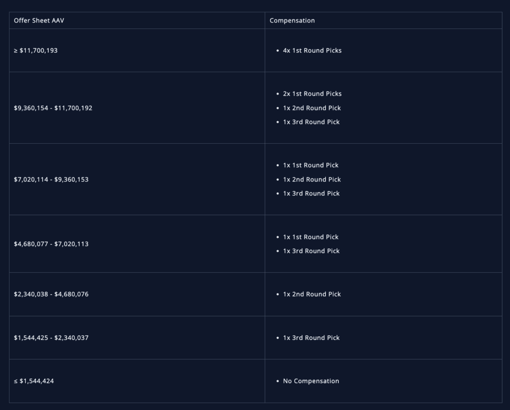 In order to acquire these players you have to be willing to give up draft capital. Here is what offer sheet compensation looks like for the 2025 off-season.