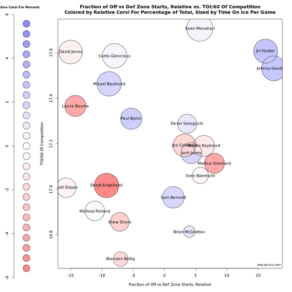 This is the time-on-ice of his competition all season. If I put up the same graphic with his teammates, it’d be about the same. He was a fourth liner early-on playing with fourth liners against depth players, and his possession numbers suffered. And then he got thrown up the depth charts, and played with good players…against really good players from the other team. And his zone starts were pretty consistent all season in terms of him spending lots of time in the defensive zone.