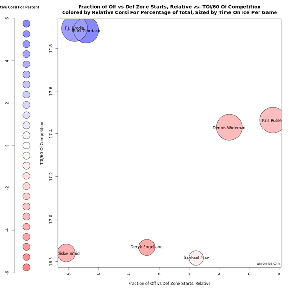We saw some regression this past season, but easily explained regression: Giordano got hurt, and Deryk Engelland became Brodie’s new partner. Engelland is not the level of Giordano, so Brodie’s possession stats went down, even though he was given easier circumstances to play in: the Engelland handicap.