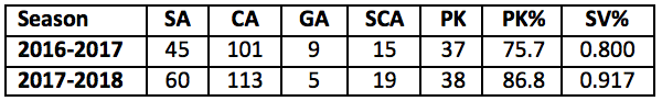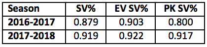 Smith (with a 12-minute Eddie Lack cameo) is a full four percentage points ahead of where the Brian Elliott/Chad Johnson duo was one year ago, including a whopping 11.7% difference when killing penalties. Even the two percent swing at even strength is significant and shows how much better this area has been.