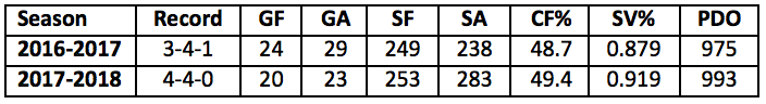 Perhaps the most disappointing study so far has been Calgary’s work defending in the early going. While Smith has been great, the Flames have put him to work far too often and have had some serious issues with shot and zone entry suppression. A look at their five-on-five outputs through eight games the last two years tells us Calgary has actually been worse defensively in October 2017.
