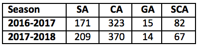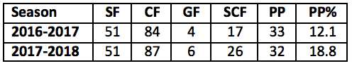 When looking at the Flames on the powerplay, you’ll see some similarities when comparing the early stages of 2016 and 2017, too. Calgary has received one fewer powerplay than at this point last year and has put almost identical amounts of rubber at the net.