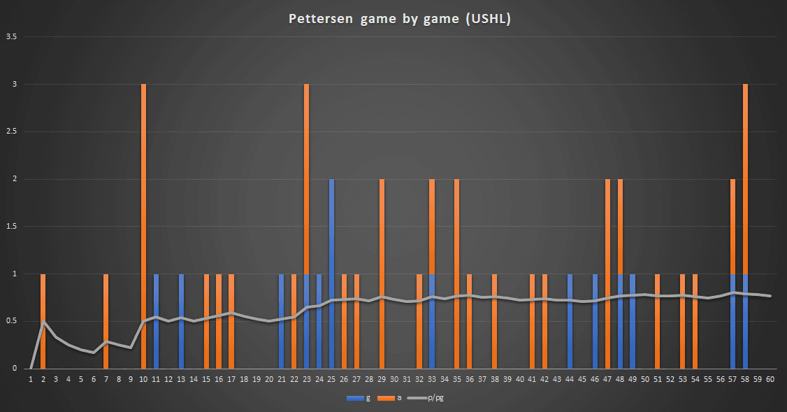 Pettersen was a pretty consistent contributor for Muskegon. Besides a slow start where he only scored two points in nine games, he became a regular point per game contributor for the rest of the season, his longest drought after that lasting three games.