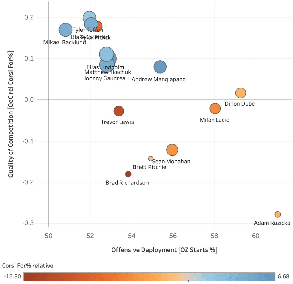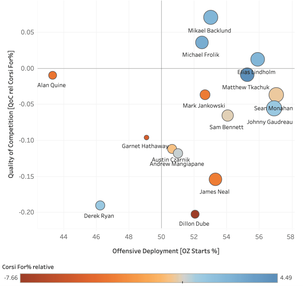 You can also see the emergence of Andrew Mangiapane, the decline of Sean Monahan, and the sheer consistency of guys like Matthew Tkachuk, Elias Lindholm and Mikael Backlund in the time on ice data here.