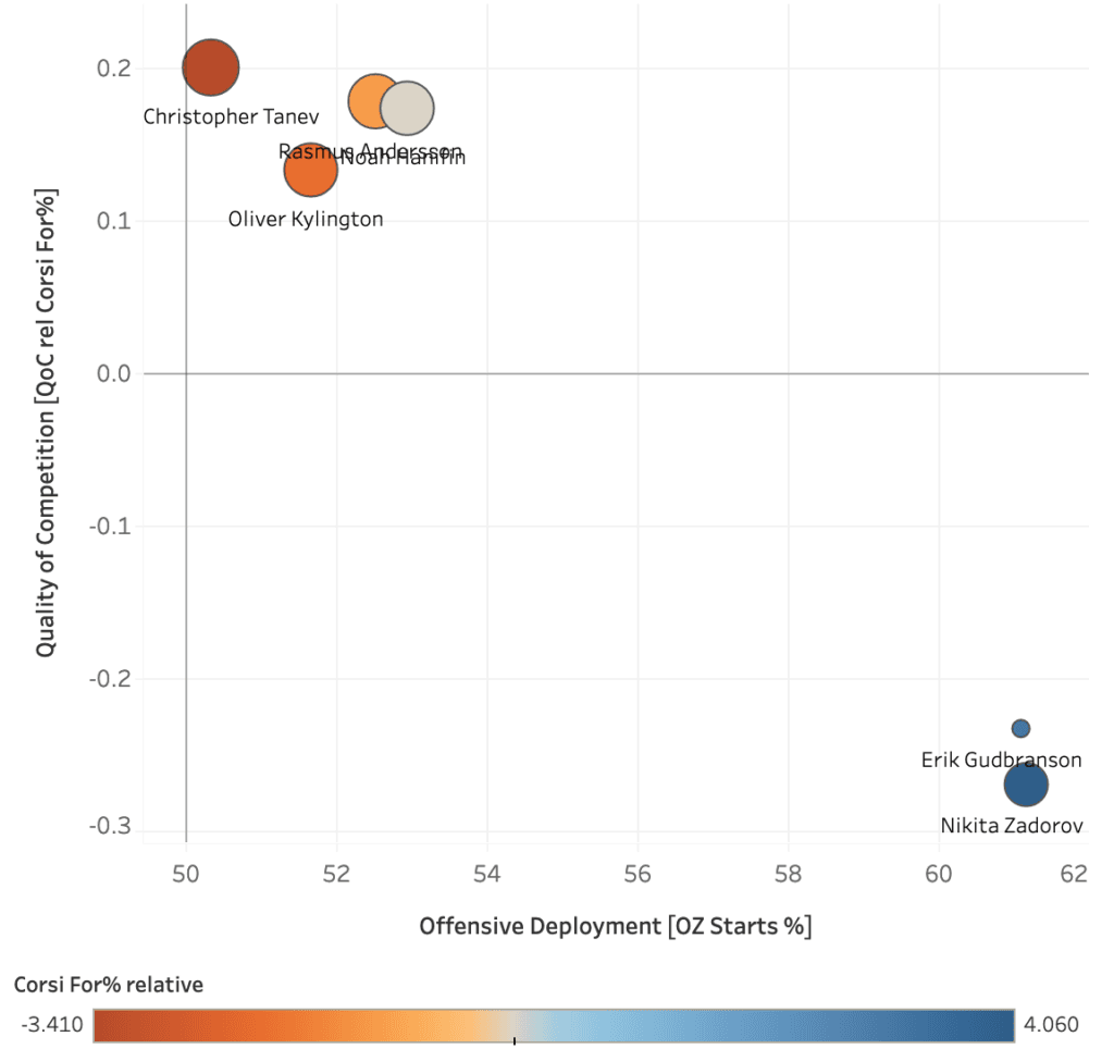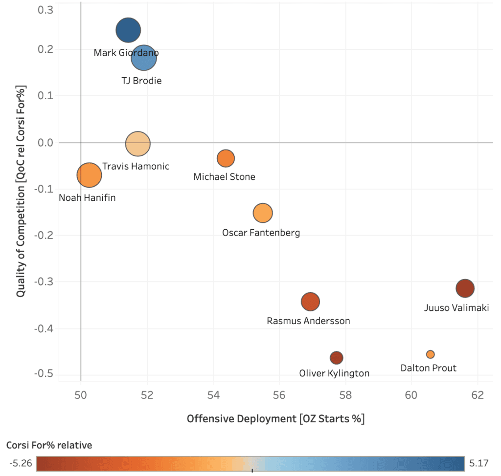 Compared to 2018-19, the top two pairings are used significantly less at five-on-five, made up with the third pairing playing significantly more. It’s pretty close to the pairings being used fairly evenly at even strength, something mentioned recently by Darryl Sutter. This balance allows the team to use the blueliners a bit more strategically on special teams, rather than, say, leaning on Mark Giordano for 24 minutes a night (and sometimes more).