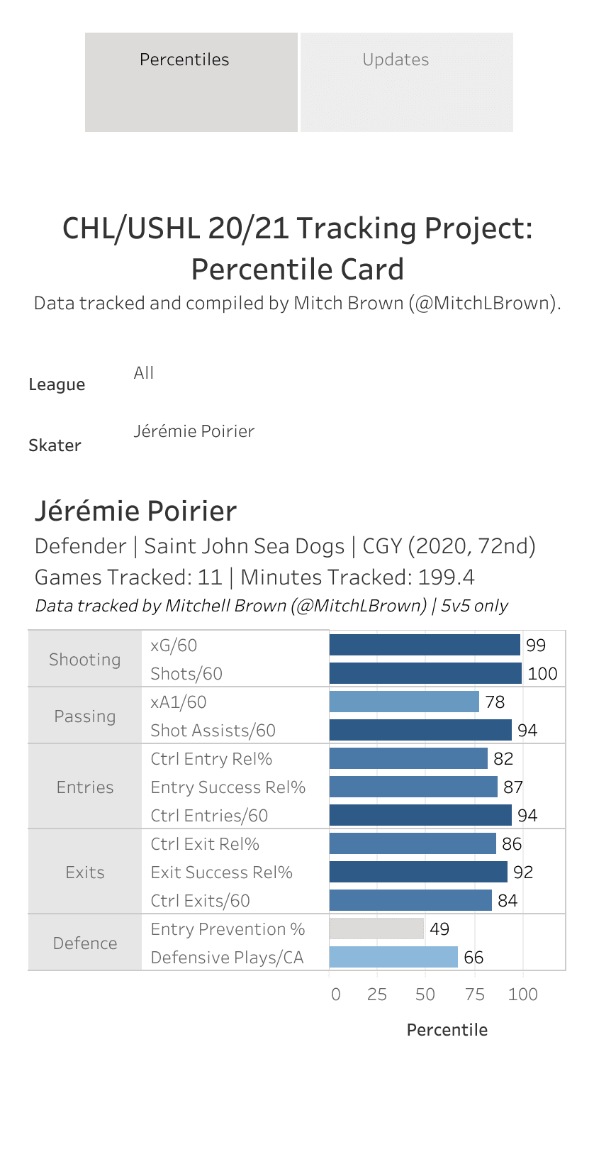 Poirier has never been one to shy away from the scoring aspect of the game. He’s an elite contributor to his team’s offence with great numbers on the boxscore as well as microstats. Here’s manually tracked data from Mitch Brown that shows how good Poirier is in transition and offensive chance creation relative to his QMJHL competition.