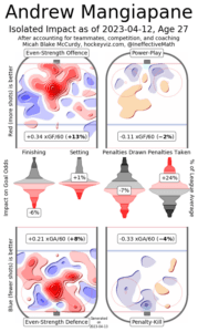One difference between last season and the season prior was Mangiapane’s defence. It was significantly worse in 2022-23 than it has been in years prior, which means it will probably regress back to what it was before. Mangiapane does best when he’s working from his own end outward.