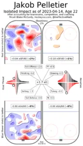 Pelletier didn’t light up the scoresheet by any means, but him having a positive analytical impact is a good sign. He could use a little work defensively, but as a young player with the skillset that he has, that’s the least of my concerns at this point. If he can continue going to the right areas of the offensive zone and regression hits his 6.3% shooting percentage positively, we could see some things go very well for him in 2023-24, and that’s just at even strength. A significant amount of power-play time would also do him wonders in the box score.