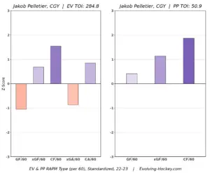 Pelletier understood that with being young comes some growing pains, such as you not playing as much as you’d probably like to every night. However, if he is able to find solid footing within the top-six of the Flames in 2023-24, we could see a big breakout come both in the box score and analytically.